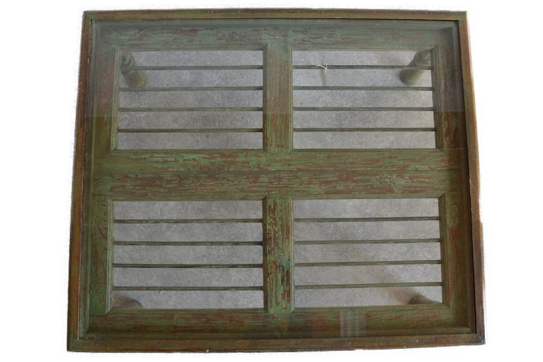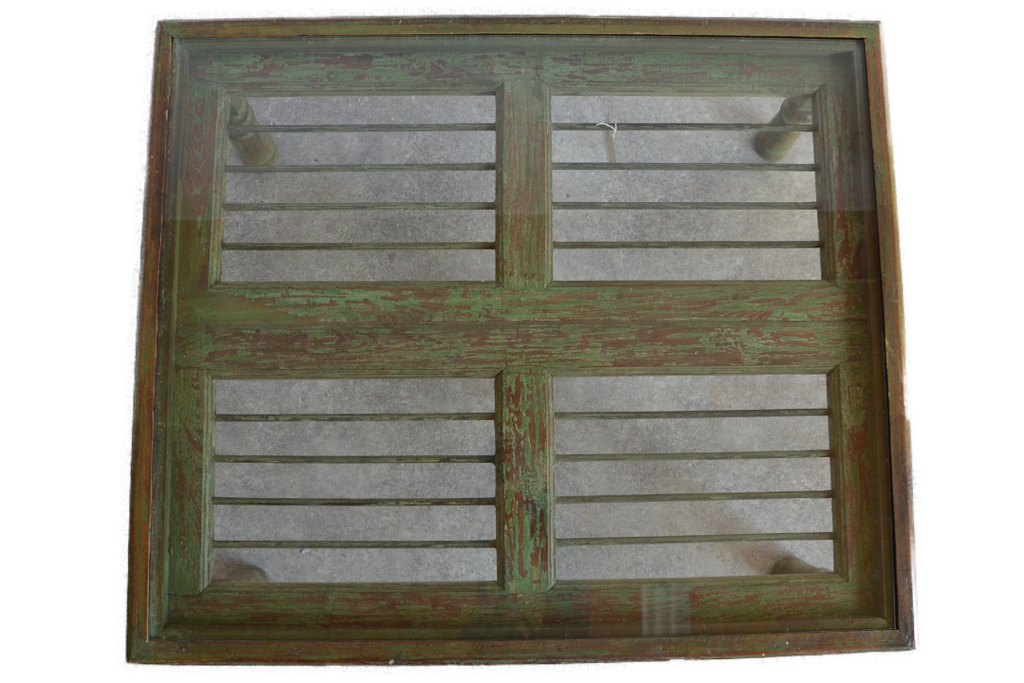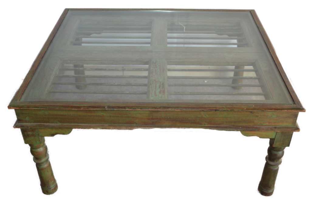 Ancienne fenêtre de teck (patiné) et de fer forgé recyclée en table avec son verre déposée.